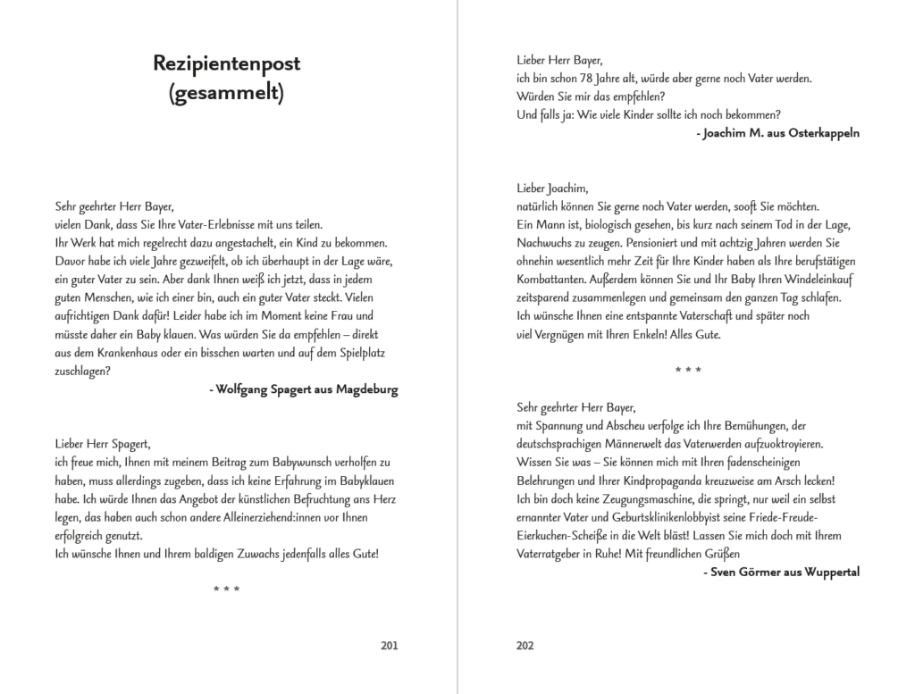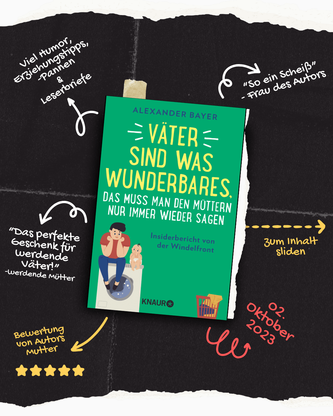 Tiefe Einblicke in das (hochfragile) Seelenleben von Vätern gibt nun einer, der es wissen muss: Der langjährige Postillon-Autor und dreifache Vater Alexander Bayer erzählt die lustigsten Geschichten aus seinem wundersamen Alltag mit Frau und Söhnen, verrät, wie sich Paare auf einen kindgerechten Sportwagen und eine faire Arbeitsteilung beim Stillen einigen, und enthüllt, wo Männer leise und unbemerkt weinen können.